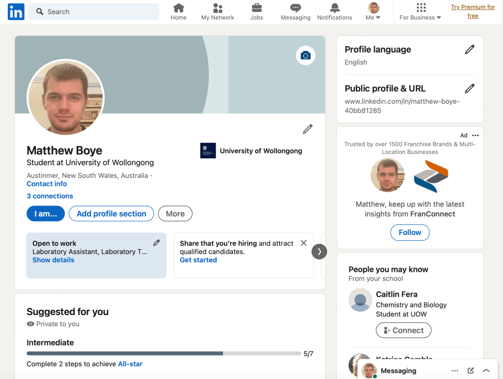 Over time I added a profile picture, ‘Top skills’, ‘About’, my UOW and TAFE education history and managed to make 3 connections on LinkedIn. I also added pathology laboratory assistant, histology technician and laboratory chemist to my list of interested jobs. Adding all these things to my profile allowed me to go from a beginner to an intermediate.