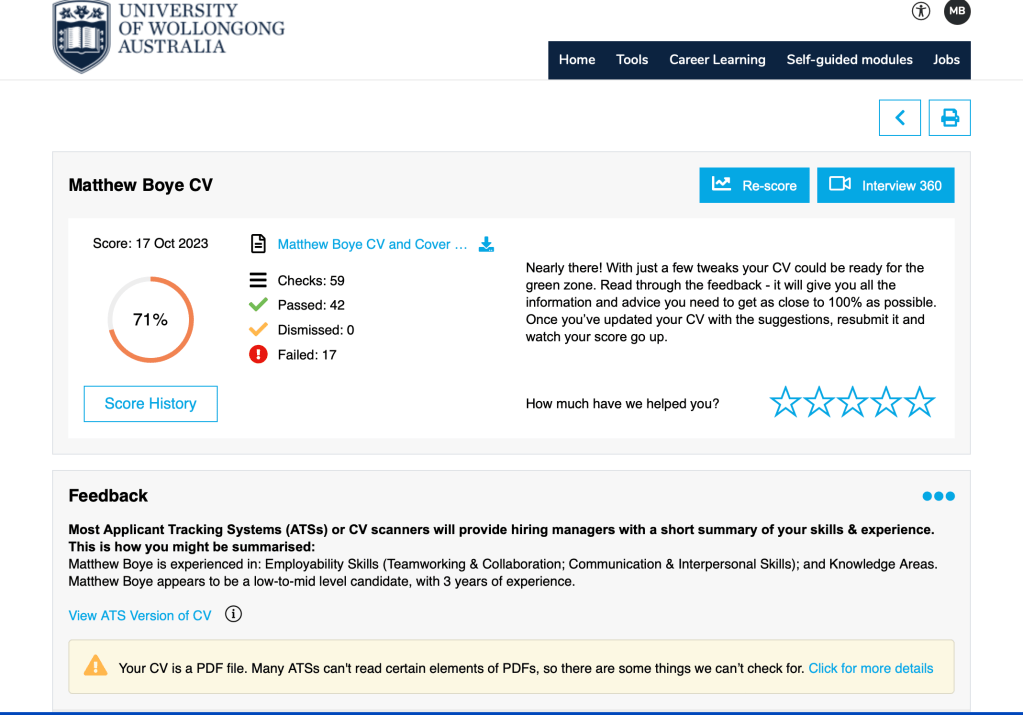 To learn more about resume writing and preparing for interviews, I attended workshops ‘Resumes: Crafting Your Story on Paper’ and ‘Interview: Ace the Conversation’. The ‘Resumes’ workshop reminded me of the sections that a successful resume needs and introduced me to CV360, an AI tool that provides instant and detailed feedback to help optimise a resume.